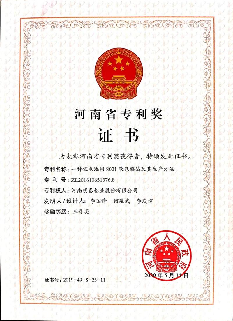 近日,河南省第二屆專利獎評選結(jié)果正式揭曉,明泰鋁業(yè)自主研發(fā)的“一種鋰電池用8021軟包鋁箔及其生產(chǎn)方法”發(fā)明專利被授予“河南省專利獎三等獎”。